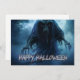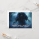 Ett dystert, flytande svart spöke med en eterisk form, omgiven av täta moln av dimma, som på ett hotande sätt svävar över marken i en mörk, helveteslandskap med en god atmosfär. Happy halloween