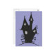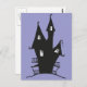 Snett kusligt spökhus i svart silhuett på lila bakgrund.