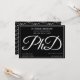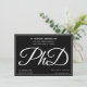 En PhD-studentfest-inbjudan i svart med vit text. Inbjudan har även en mönster i ord PhD, skrivet, på baksidan.