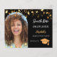 Observera att det här Spara datumet är pappert och mycket tunt. Kuvert ingår inte. Om du vill ha tjockare Spara datumkort (samma design) kan du besöka vår butik. Ett foto Spara datumkortet för en studentfest 20XX. På framsidan: Lägg till ett eget lodrät storlekt foto av student. En båge formad ram. En chic svart bakgrund färg, dekorerad med faux guld-stjärnor. Anpassa och lägg till namn och datum. Namn och texten: Spara datumet är skrivna med ett modernt handskript i stil. Tillbaka: Information om party.