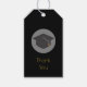 Ett tack som du ger märkre designad med en svart studentmössa med en halvgenomskinlig cirkel bakom. Den svarta bakgrunden med guld-bokstäver är enkel än snyggt.