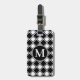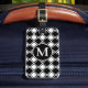 Svart runt den klassiska serif-monogrammade, schaktade, mönstrade bagagetaggen i ram