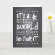 Önska dem en lycklig studenten med denna roligt och svart tavladesign för trendig. Presentera roligt typsnitt på en svart svart tavlabakgrund, kortnågot att säga "är det en stor värld ut där, går för det!", på täcka och "grattisen avlägga examen" på insidan.