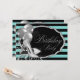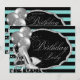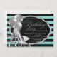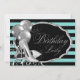 Kvinnas svarta och tealblå födelsedagsfest-inbjudan med eleganta silverglittrande högklackade skor och silverballonger på en vacker tealblå och svart randig bakgrund. Denna eleganta tealblå och svarta födelsedagsinbjudan kan enkelt anpassas för ditt evenemang genom att helt enkelt lägga till dina uppgifter i den teckensnittsstil du väljer. Detta är en tryckt design utan riktig glitter etc.