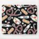 Utskriftsblocket för Nurse Kärlek. Nurse Hat, Hjärtstetoskop, Bandage och medicinering i svart bakgrund.