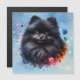 Ett mycket detaljerat och dynamiskt exempel på en flytande svart Pommern-hund med uttrycksfullt ögon och en mjuk, omfångsrik jacka. Bakgrunden är ett dynamiskt stänk av färgat vattenfärgsfärgat stänk som skapar en konstnärlig och lekfull atmosfär. Hund päls accentueras och lyser och struktur, vilket understryker dess förtjänstfulla karaktär.