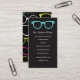 Dessa är den stilfulla visitkortperfekten för ögadoktorer och optometrikrar. Korten presenterar en vertikal orientering med en svart bakgrund med ljust färgaden utskrivavet mönster av glasögonramar på baksidaen, och som matchar en blått exponeringsglas, inramar grafiskt på bekläda. Använd påfyllningen i de tomma fälten lätt för att skräddarsy dessa kort med din information.
