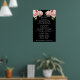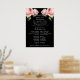 Bröllopsprogram skylt med en vintage illustration av rosa blommor och grönska på en klassisk svart bakgrund.