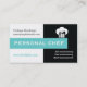 Affärskort för svartvit, akvatisk kock med en vit kock, som fångar svarta, vita öga- med en vit kock - toque med en gaffel, sked och knivar på svart bakgrund och texten "Personal Chef" i ett akvblått band. Utformning av professionellen för perfekter för huvudkockar, personkockar, kulinarier, kock de cuisine, chef, chef eller catering.