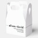 Utformningen av den här bröllopsförmånslådan är ren och modern, med en elegant och underskattat stil. Typografin är elegant och minimalistisk med hjälp av ett svart-vitt färg-system. Överst på lådan finns en vågrät som snurrar runt och visar makens namn på ett fint sätt. Tillsammans med ett hjärtligt "Tack"-meddelande innehåller rutan även det viktiga datumet för bröllop, skapar det en personlig och chic.
