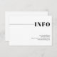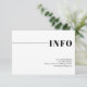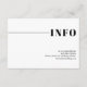 Kortet i inneslutningen i bröllop har en snyggt och en minimalistisk typografisk utformning som på ett effektivt sätt fångar enkelhetens kärna. Den svarta och vita färg-kombinationen förstärks av det stora vita utrymmet, vilket belyser det smala och rena linjerna i designen. En vågrät överst på kortet tillför en inslag av sofistikering, och ord "INFO" utökar på ett smart sätt linjen mot högerna. Kortets baksida innehåller en QR-kod som gör det enkelt för gästerna att få tillgång till all nödvändig bröllop-information.