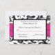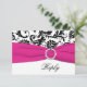 Detta svart och vita blomster-damask svarskort har ett varmt rosa BAND med en kristalljuvelbroche på som matchar bröllopsinbjudan nedan. Om du behöver andra matchande föremål eller vill ha det i en annan färgkombination, vänligen maila niteowlstudio@gmail.com med din förfrågan.