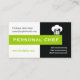 Affärskort för svartvit grönt med svartvit kock som minimalistisk öga-kock, med en vit kock - skaka med gaffel, sked och knivar på svart bakgrund och texten "Personal Chef" i ett kalkgrönt band. Perfekt för feminin professionell för huvudkockar, personkockar, kock de cuisine, chef, chef eller catering.