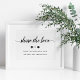 Vår enkla och eleganta hashtagskylt låter gästerna veta om din anpassade bröllopshashtag för delning på sociala medier. Anpassa rubriken och hashtaggen (visas med "Dela Kärleken") i tydlig svart kalligrafiskrift och klassisk blockbokstav. Inkluderar två sociala medier-ikoner sammankopplade med ett hjärta.