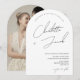 Bjud in gästerna till er speciella dag med den svarta vita moderna chic minimalistiska scripten Anpassad Förlovningsfoto Bröllopsinbjudan! Med en elegant bågformad design, minimalistisk stil och utrymme för din förlovningsbild är denna inbjudan perfekt för snygga och personliga bröllopsinbjudningar.