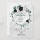 romantiskt svartvit och teal blåa blommor och löv på grått-marble bakgrunden botaniskt krans inbjudningskort för möhippan. glitter-uppgifterna simuleras