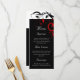 Dold och slående moderna bröllop-menykort med svart-contemporary med vit och röd accent, med delikat rulla löv-bakgrund. Anpassa onlinen med information om din bröllopsmottagningsmeny.