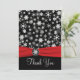 Det här festliga svarta och vita snöflingor tacksamhetskortet har ett FALSKT rött band och snöflinga medaljong på sig. Det matchar bröllopsinbjudan som visas nedan. Det finns också ett litet tacksamhetskort i gratulationskortstil som visas nedan, om du föredrar det. Om du behöver andra matchande föremål i denna design, vänligen maila din förfrågan till niteowlstudio@gmail.com.