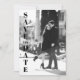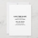 Söt och enkel modern svart-vit bröllopskort för att spara datum. Framsidan visar en fullstor bild efter eget val. Den är för närvarande konfigurerad med svart-vit filter, men du kan använda färg om du föredrar det. En fet och enkel 'Spara datum' ner längs vänster sida. På baksidan finns mer detaljerad information att dela med dina gäster.