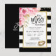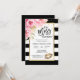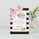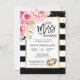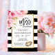 Trendiga och moderna redigerbara mallar för inbjudan till bröllopsdusch i vitt och svart ränder. Falsk guldram med akvarell rosa blomma i hörnet, läppar. All text kan redigeras och ändras; teckensnitt, färg och storlek. Kontakta formgivaren för andra variationer eller hjälp.