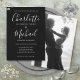 Med signaturstilnamn kan denna eleganta svarta och vita bröllopsinbjudan anpassas med din information i chic vit bokstavsstil med ditt valda monokroma foto på baksidan. Designad av Thisisnotme