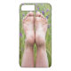Par av smutsiga, små fötter i lila vilda blommor i sommarängen.