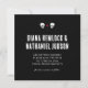 Två dödskallar delar utseendet av kärlek på detta svarta bröllops kallelse. Om du är en häxa, trollkarl, pirat, goth eller bara en person av natten och inte är rädd för mörkret, är denna inbjudan för dig. Texturerade typsnitt och en enkel och ren layout gör parets namn till fokus och lätt att redigera texten dirigerar gästerna till en webbplats för mer information om bröllopet och relevanta evenemang.