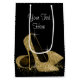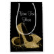 Kvinnas svarta och gyllene presentpåse med vackra gyllene glittriga höga klackar skor och plats för text. Du kan också ändra bakgrundsfärgen. Detta är en tryckt design med ingen riktig glitter.