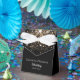 En svart bakgrund i snyggten som dekoreras med faux guld-gnistor. Med texten: Bröllop och Tack skrivet med ett modernt handskript i stil. Anpassa och lägg till namn och datum.