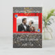 Elegant svart och guld inbjudan med röd sidenintroduktion visar fotografiet av paret. Bilden är dekorerad på övre vänstra och nedre högra sidan med en guld- och blå safir-diamantbrosch.