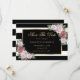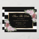 Elegantens svarta och vita, randiga blommigt bröllop spara datum-kort med rosa blommor som ramar in uppgifterna om bröllop i en guld ram mot en svart och vit bakgrund. Svart och guld bröllop spara datum-kort. Matchande objekt är tillgängliga.