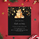 En inbjudan till en julfest. Svart bakgrund. Dekorerad med gyllene stjärnor och en trave presenter. Anpassa och lägg till detaljerna. Vit text.