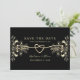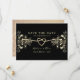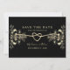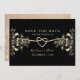 Notera din artikel i kärlek med tidlös elegans med hjälp av vår vintage chic "Spara datuminbjudan". Med en lyxfärgad svart bakgrund som är försedd med ett romantiskt guld-rep-hjärta och bohemiska guldblommor kombineras klassisk sofistikering med en aning bohemisk charm. Perfekt för ett bröllop som firar både romantik och stil.