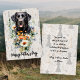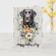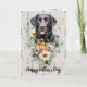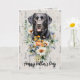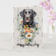 Svart labrador fadersdagskort med meddelande inuti. Schackpjäser bakgrundsdesign med anpassad hälsning på framsidan. Labrador retrievern sitter bland vilda blommor i denna design. Alla delar av kortet, både inuti och utanpå, har ett bakgrundsmönster av schackpjäser och hjärtan i ljusa sepia nyanser.