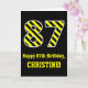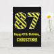 Fram sidan av denna roliga och djärva födelsedagskortdesign syns ett stort nummer "87" med ett randigt svart-gult mönster. Den har också texten "Grattis på 87-årsdagen," och ett anpassningsbart namn. Framsidans bakgrund är svart. Insidan har ett anpassningsbart födelsedagsmeddelande, eller kan lämnas tom om man vill skriva ett eget meddelande för hand istället. Ett personligt födelsedagskort som detta kan vara ett roligt sätt att skicka födelsedagsönskningar till någon som firar sin åttiosjunde födelsedag. [~Z0000382]