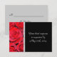 Bright röd ros klär upp den lämnat sidan av detta svarskort från bröllop. Din text är på en dramatisk svart bakgrund och är skild från bilden av ro med ett "menyfliksområde" i silver. Kortets baksida är grått som gör det lätt för de svarande att märka. **Obs! Bilden skrivs ut på kortet, som inte innehåller någon faktisk struktur eller något menyfliksområde.** Det finns flera matchande produkter i min butik. Klicka på en bild nedan om du vill visa den enskilda produkten.