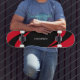 Svarta och röda vågiga linjer med svart mitt och kalligrafi Skateboard.