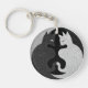 Tydlig svartvit illustration av två katter som är vända mot varandra i ett runt ram. Den lämnat katten avbildas i ljusskuggor, medan den höger katten är mörk. Deras former sammanflätar för att bilda ett hjärta i mitten, symboliserar koppling eller enighet. Båda katterna har uttrycklig ögon och tydliga ansiktsdrag, och bakgrunden är fylld med kompakt mönster som förbättrar den övergripande utformningen. Kontrasten mellan svart och vitt lägger till djup och visuellt intresse i teckningen