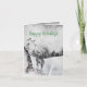 Ett svart-vitt julkort med akvarellmålade skogsdjur samlade vid ett träd under snöfallet.