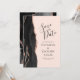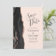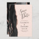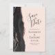 Det moderna bröllop spara datum-kortet från elegantens lämnat kant har en svart vattenfärgad agat gräns som trimmas med faux ro guld glitter. Anpassadet kombinerar svart handskrift, tryckplåt och kursivt typsnitt på rosa. Den omvända sidan har en matchande svartvit och ro guld-agate-design.