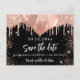 Ett giftigt och trendig Spara datum för en 18:e (eller någon annan ålder) födelsedagsfest. En svart bakgrund med droppar och ballonger från ro guld. Anpassa och lägg till datum och namn/ålder. Texten: Spara datumet skrivs med ett stort trendig-handskript i stil.