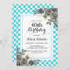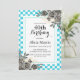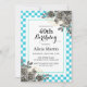 Den här floran-födelsedagsinbjudan i elegant innehåller blommor från guld och svart ro med löv arrangemanga på den vita och turkockkontrollerade bakgrunden.
