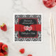 Den här personligen och romantiska bröllop-servetter är perfekt till använda på din bröllopsdag, möhippa eller repetitionsmiddag. De här svarta och vita dammmönstren bröllop-servetter är säkert en minnesvärd slå med dina gäster och är ett annat sätt att behålla ett sammanhängande utseende över hela bröllop firande. Det fyrkantiga designområdet för dessa bröllop-servetter har ett rött band och en bågbild med gått med hjärtan bilder över mitten. Det finns röda blommor i alla fyra hörnen. Över menyfliksområdet, ord, "Tack för att du firar med oss!" trycks i vitt skript på svart bakgrund. Under menyfliksområdet trycks namnen om paret lycklig och datumet bröllop i vitt och rött. Om du behöver några andra matchande objekt kan du skicka e-post till niteowlstudio@gmail.com och titta på skräppostmapparna för mitt svar, eller använda Zazzle-chattan för att kontakta mig.