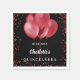 För en elegant Quinceañera, 15:e födelsedagsfesten. Chicens svarta bakgrund. Dekorerad med röda konfetti och ballonger. Anpassa och lägg till namn och ålder/text