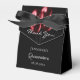 Elegant, klassisk, glamorös för ett Quinceañera-party favors. En svart bakgrund, dekorerad med ballonger med röd färgad. Med texten: Quinceañera och Tack skrivet med ett modernt handskript i stil. Anpassa och lägg till ett namn och ett datum.