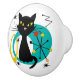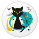Färgfull illustration av Mid Century stil med svart katt, svarta stjärnor och färgfulla cirklar dekoration på vit bakgrund