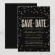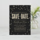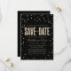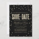 Den här moderna och snyggt bröllop spara datum-annonsen från The Spoted Olive™ ger en bild av guld glitter som ser konetti-punkter på en svart bakgrund med orden "SPARA DATE" fylld med en bild av guld glitter. OBSERVERA: DENNA UTFORMNING ÄR EN BILD AV KONFETTIEN I GLITTER. DET FINNS INGEN GLITTER, KONFETTI ELLER EMBELLISHMENT. DET HÄR ÄR EN FLAT SKRIVEN FORMGIVNING. COPYRIGHT ©2014 The Spoted Olive™. Alla rättigheter förbehållna.