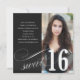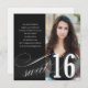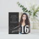 Den här sweet sixteen inbjudan innehåller en ren svart remsa med en vit textövertäckning. Bilden på din födelsedag visas på högerna, och hennes party-detaljer finns på den lämnat i vitt mot en svart bakgrund.
