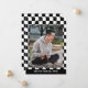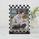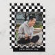 Unikt och trendig grattiss student-meddelandekort med en klassisk flagga för svart och vit tävla i mönster. Med utrymme att anpassa eller anpassa sig med ett foto, namn i student, klassår studenten, högskola och framtida högskola eller universiteten namn. Låt familjen, vännerna och grannarna veta att det finns ett redo i lycklig student för att erövra världen, och inbjudan alla för att kom fira evenemanget i lycklig med er!