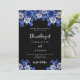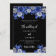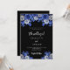 En svart bakgrund, dekorerad med blå och vita blommor. Anpassa och lägg till namn och information. Bakåt: svart bakgrund.